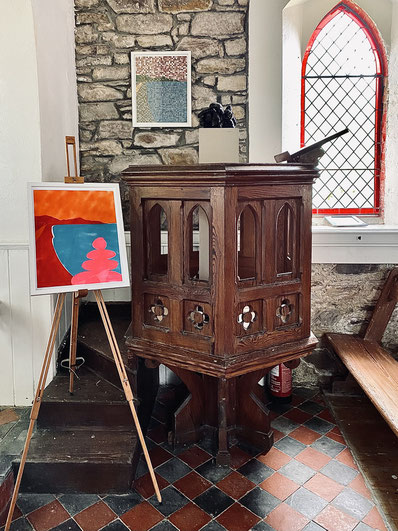 "The group exhibition in the deconsecrated Belfry Church in Glenbeigh took place just a week after my solo exhibition. The presentation was, as we say, knitted with hot needles. Nevertheless, we were able to collect some very good work by local artists in this special room. Luckily, I had my sculpture "Cromane" in Glenbeigh. I had shown it for the first time a year earlier at the K-Fest in Killorglin. They are interlocking shells from the neighboring Cromane Beach. Confidentily seated on the former pulpit, the interest in this locally related work was again very high. Also I have set a colorful graffiti of Rossbeigh Beach, which is limited to 24 pieces. And the mosaic created from the sketch, which is implemented in more discreet metallic colors. The famous crime author William Shaw was my first client at this exhibition." Markus Ehrhard